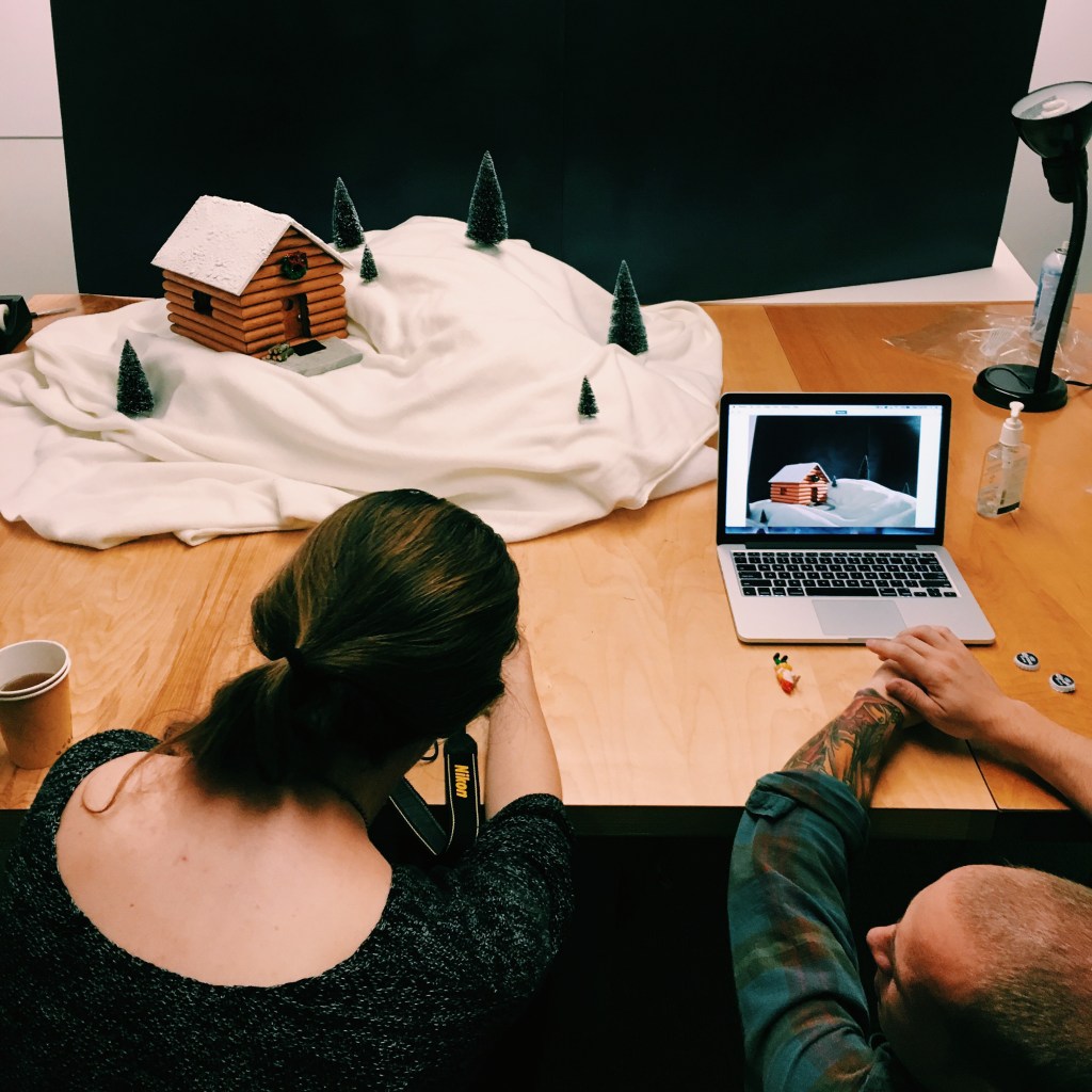 I mocked up a composition for the design, and once it was approved, I worked with my father to build the miniature cabin. My manager and I built the set in a conference room. A member of our social media team assisted with the photography.