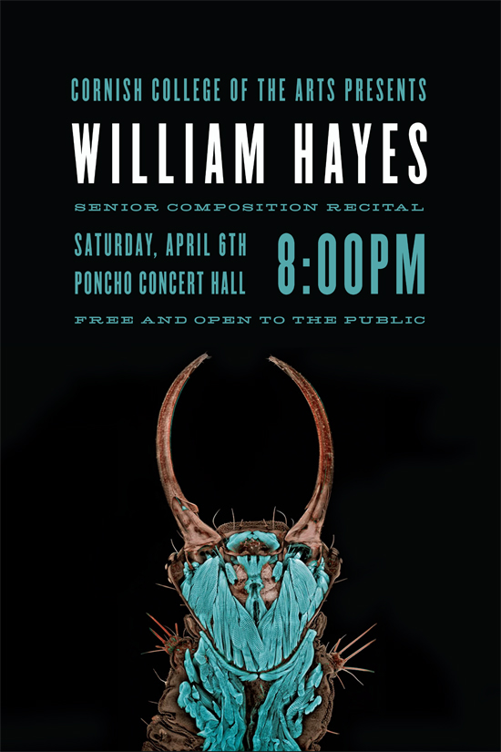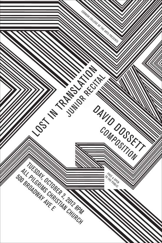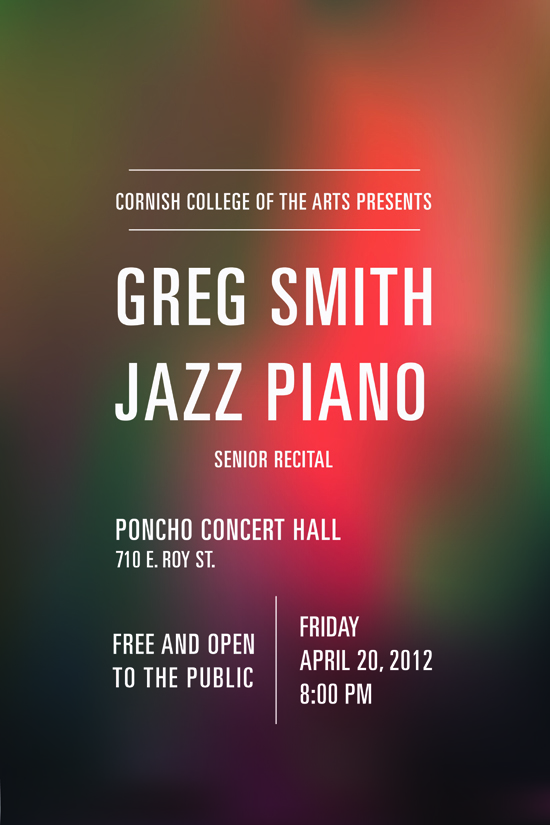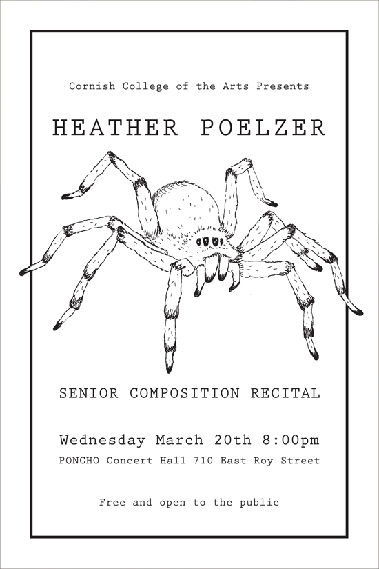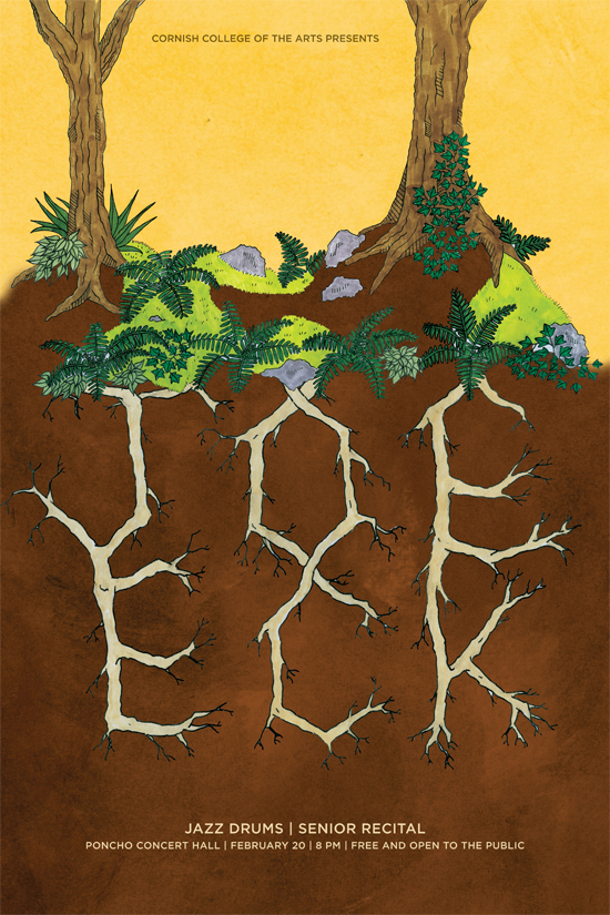 My key responsibility when I worked for the Cornish College of the Arts music department was designing recital posters for the juniors and seniors. I required each student who wanted a custom poster to send me photos that they either wanted me to use as reference for my design or wanted included in the design. I worked directly with each student to create unique designs that they felt would represent their music in some way.